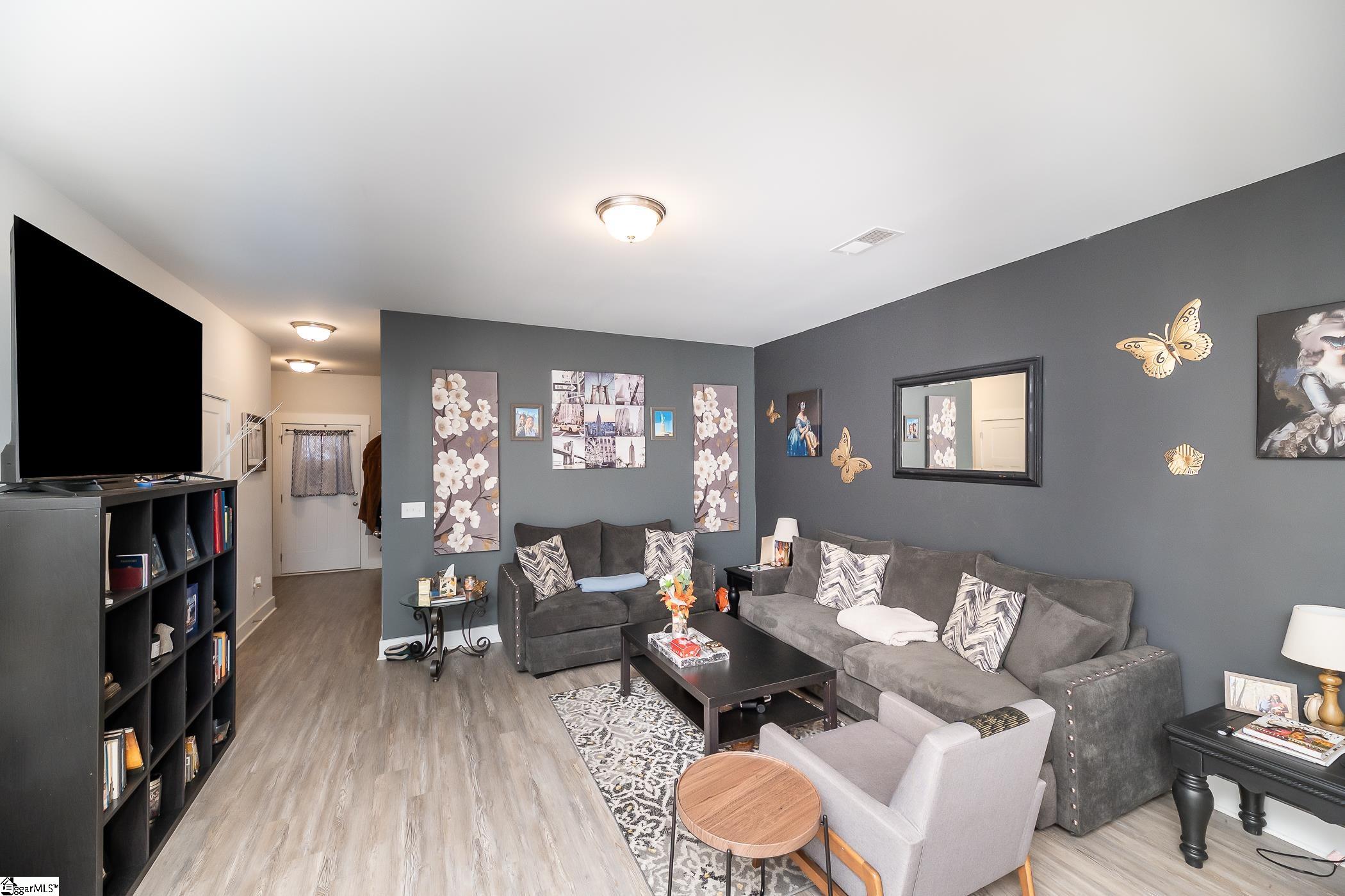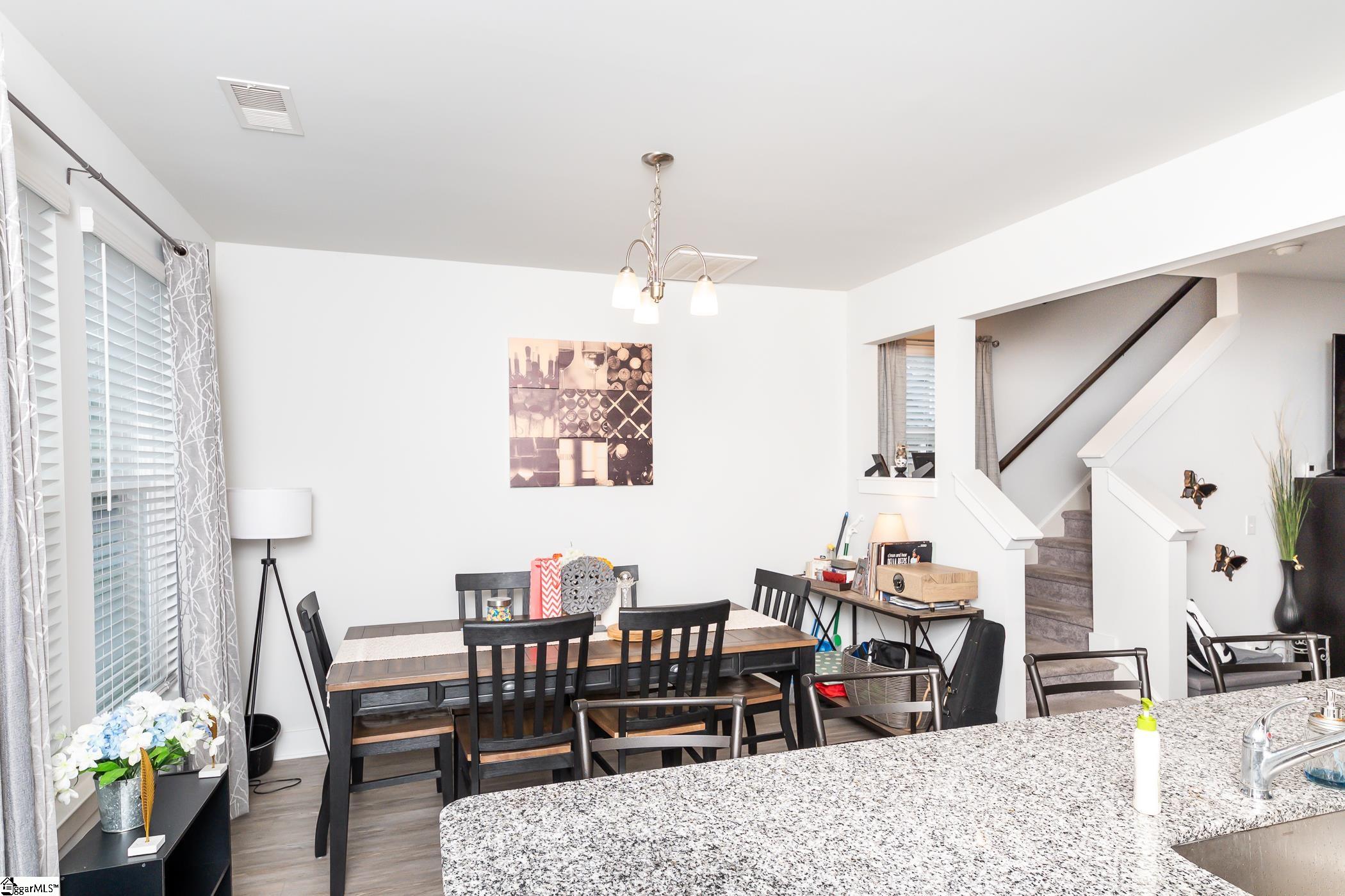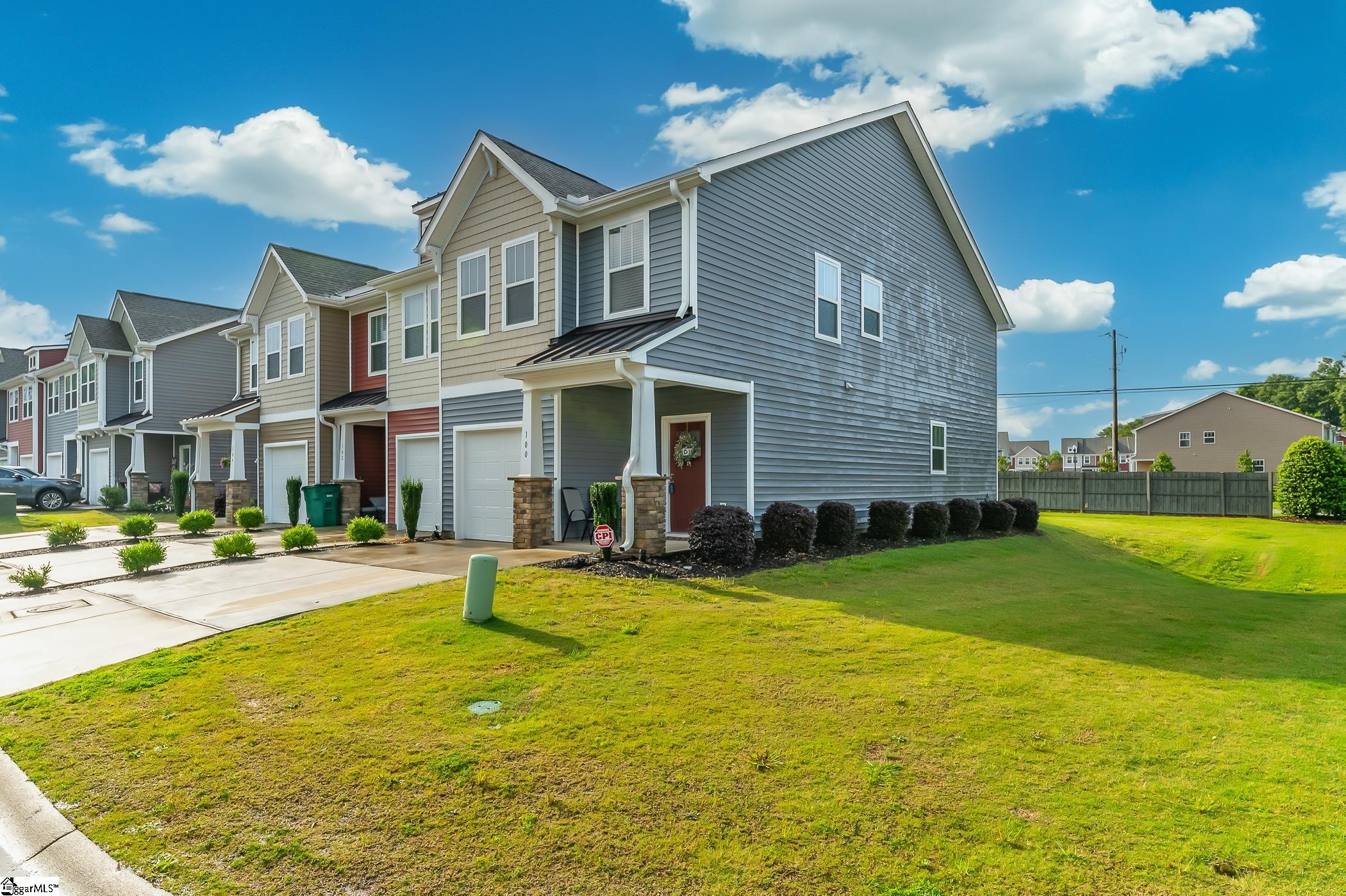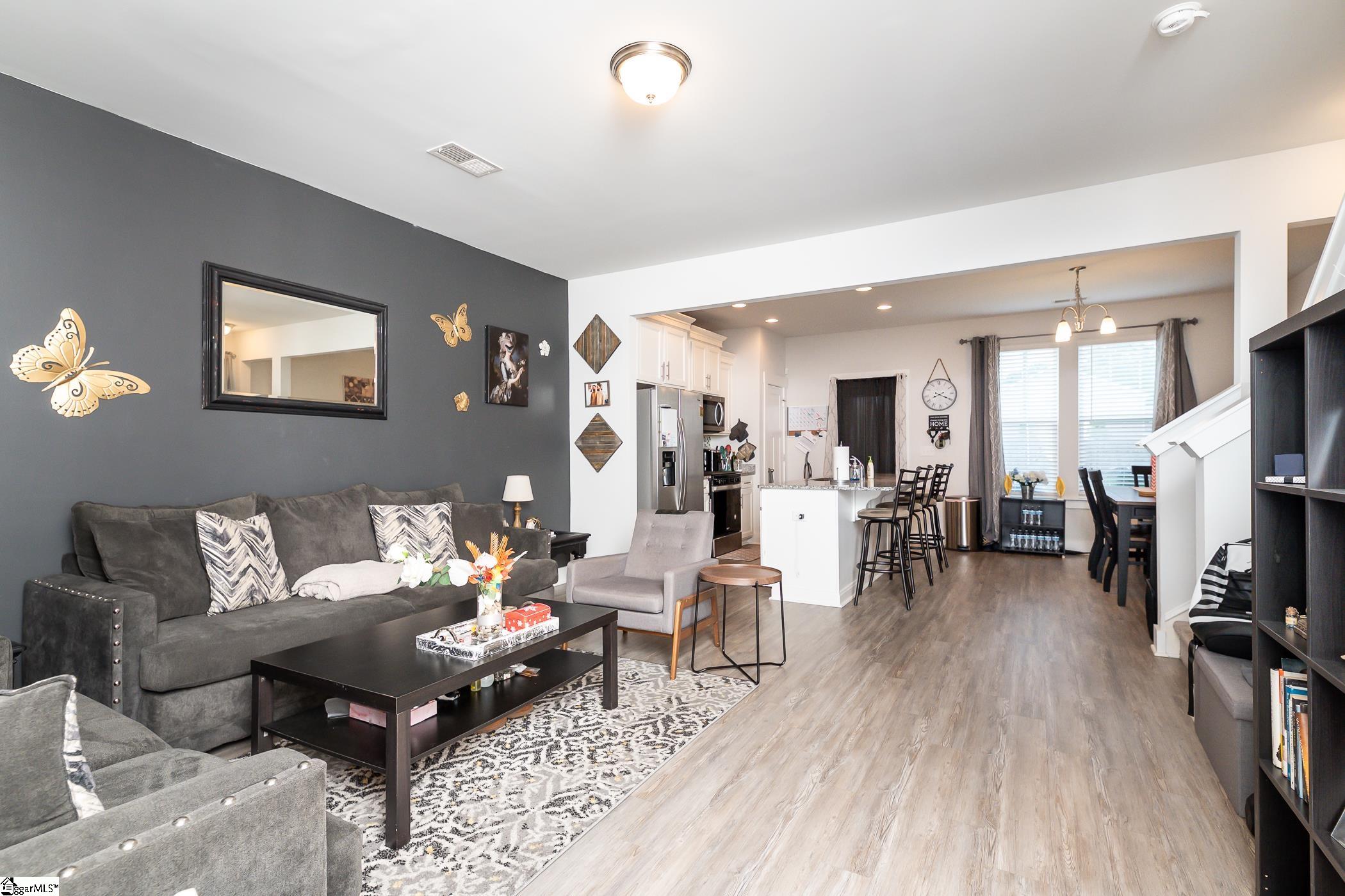 This inviting end-unit townhome is nestled on a quiet street in Lakeview Chase Townes. As you enter, you're greeted by luxury vinyl plank floors, smooth tall ceilings, and a spacious open floor plan with abundant natural light. The open kitchen boasts recessed lighting, stainless steel appliances (including a gas range), granite countertops, a large island with a breakfast bar, ample cabinet and counter space, a pantry for additional storage space, and an adjacent dining area. The spacious master bedroom is separate from the other bedrooms and features a walk-in closet and a private en suite bathroom with a dual vanity, a separate water closet, and a large walk-in shower. The laundry room is conveniently situated upstairs with the bedrooms. The patio, with adjacent storage closet, and the backyard area will be perfect for grilling out and entertaining. Located just minutes from shopping, dining, and the interstate. It's also just a short drive to Downtown Greenville. Come see your new home, today!